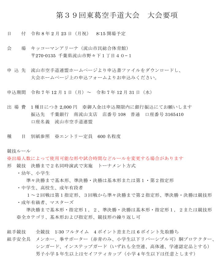 で対応いたします。ただしトーナメントの変更は流山市空手道連盟大会委員の誤りに起因する場合のみとさせて