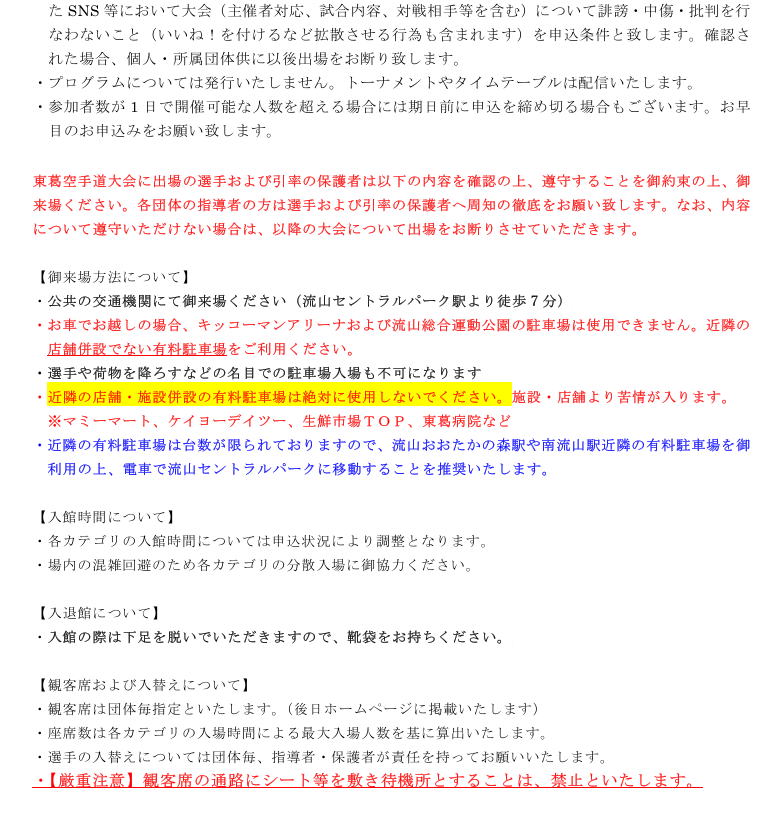 駐車ができない、駐車場での事故、その他交通に関する問題に関して大会本部は一切の責任を負いませんので、